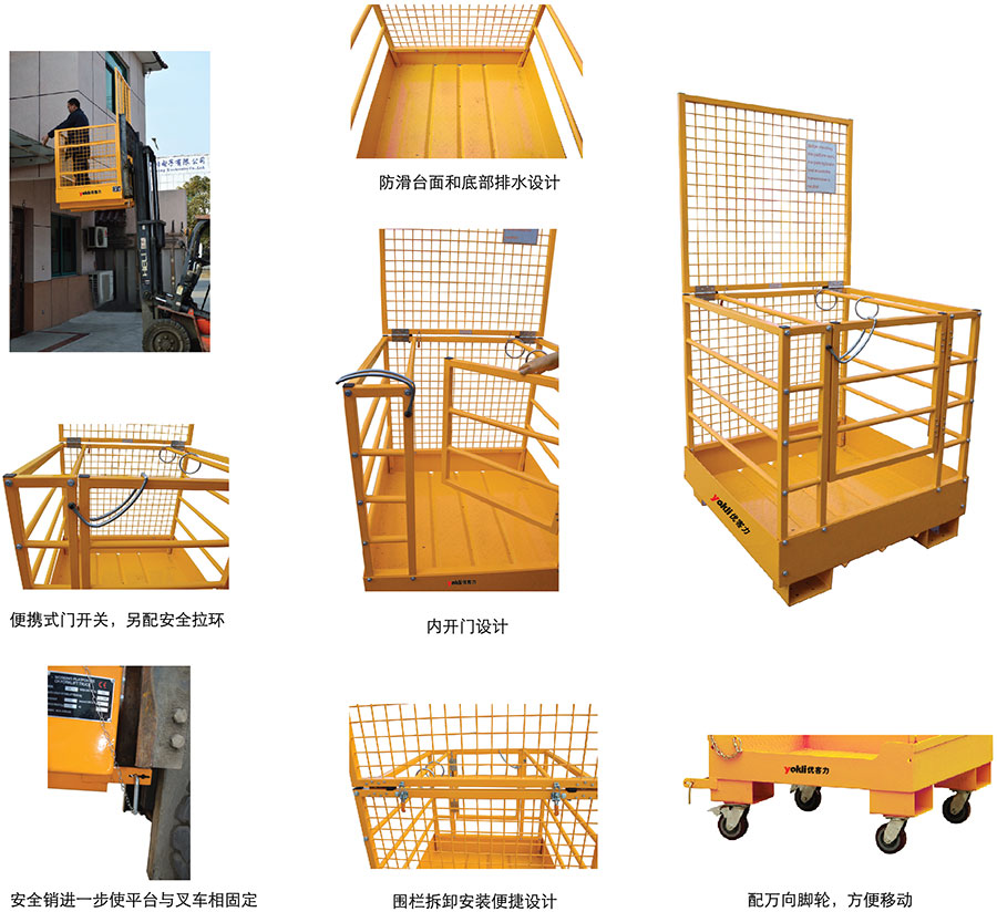 ● 載人平臺通過安全長銷和和鏈條固定在貨叉上,確保不會滑動。