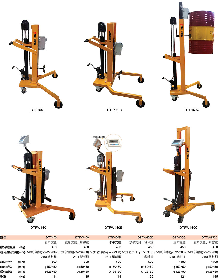 ● DTF450 DTF450C,支腿為直角型,適用于堆放在托盤邊角的油桶進行操作,從托盤的對角線方向搬運油桶。