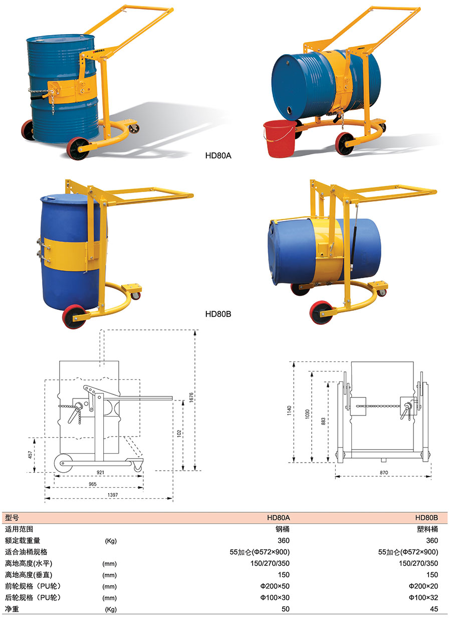 ● HD80B可用于塑料油桶搬運。